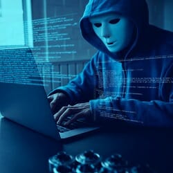 Asian people hacker wear a mask using a laptop cyber attack.
