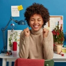 Cheering dark skinned woman clenches fists, prays for good luck, works in study room, prepares for writing coursework, poses against workplace with decorated New Year tree, watch and desk lamp