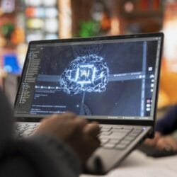 Call center worker using AI tech on laptop to reply to customers, closeup
