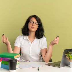 - young-pleased-pretty-caucasian-schoolgirl-wearing-glasses-sits-desk-with-school-tools-pretends-meditate-with-raised-hands-isolated-green-space-with-copy-space